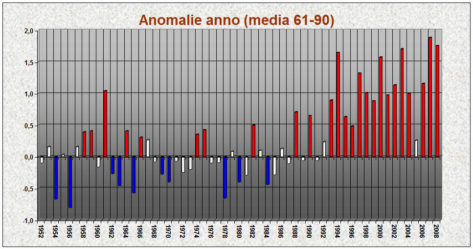 Scarto temperature in °C dalla media 1961-1990 anno per anno: