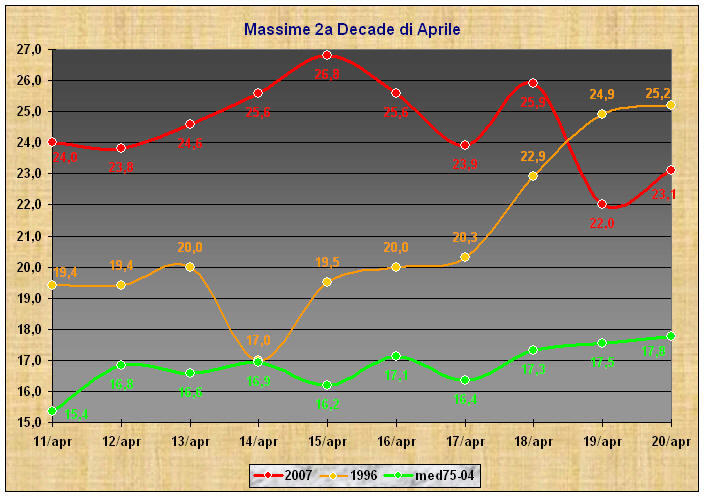Come si può notare anche nell'Aprile 1996 tutti i giorni si ebbero massime sopra la media. Ma nel 2007 è cambiata notevolmente l'intensità di questa anomalia. Con punte di oltre 10°C sopra la media. La massima di 26.8°C registrata il 15 Aprile 2007 è inoltre la massima più calda per la seconda decade di Aprile, il precedente record, stracciato, era di 25.2°C, proprio del 20 Aprile 1996.