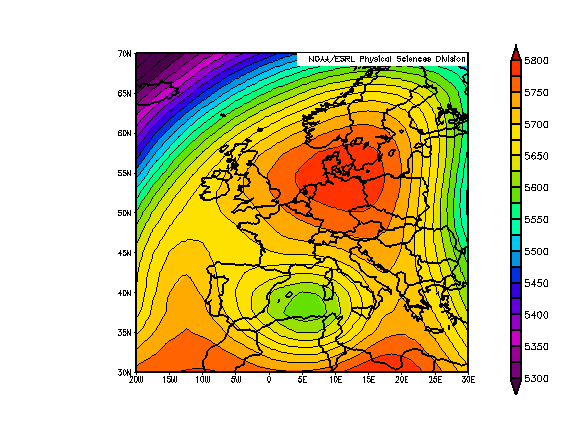 Goccia fredda tra penisola iberica e Marocco, prima risalita di calde correnti africane verso l'Italia.